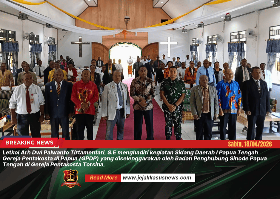 jejakkasus News |Nabire – Komandan Kodim (Dandim) 1705/Nabire Letkol Arh Dwi Palwanto Tirtamentari, S.E menghadiri kegiatan Sidang Daerah I Papua Tengah Gereja Pentakosta di Papua (GPDP) yang diselenggarakan oleh Badan Penghubung Sinode Papua Tengah di Gereja Pentakosta Torsina, Jalan Christina Martha Tiahahu, Kelurahan Kalibobo, Distrik Nabire, Kabupaten Nabire, Provinsi Papua Tengah. (17, April 2026)