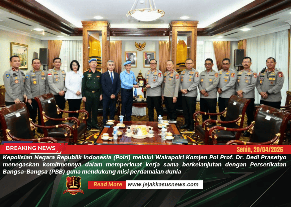 Jejakkasus News |Jakarta, 20 April 2026 — Kepolisian Negara Republik Indonesia (Polri) melalui Wakapolri Komjen Pol Prof. Dr. Dedi Prasetyo menegaskan komitmennya dalam memperkuat kerja sama berkelanjutan dengan Perserikatan Bangsa-Bangsa (PBB) guna mendukung misi perdamaian dunia, dengan penekanan utama pada jaminan keamanan dan keselamatan personel yang bertugas di wilayah konflik.