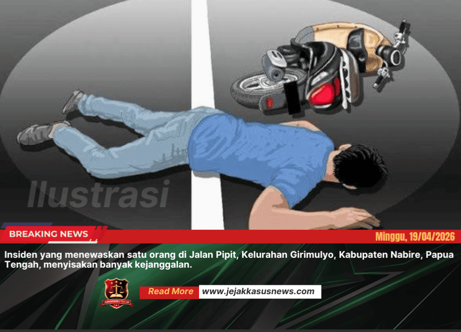 Jejakkasus News | Nabire Papua Tengah, Minggu 19 April 2026 – Insiden yang menewaskan seorang pria (41) di Jalan Pipit, Kelurahan Girimulyo, Kabupaten Nabire, Papua Tengah, menyisakan banyak kejanggalan. Dugaan awal kecelakaan kini dipertanyakan keras oleh keluarga korban dan masyarakat sekitar.