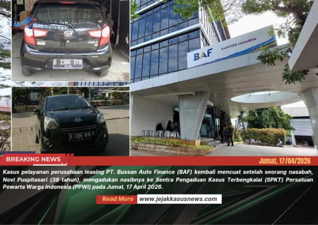 jejakkasus News |Jakarta – Kasus pelayanan perusahaan leasing PT. Bussan Auto Finance (BAF) kembali mencuat setelah seorang nasabah, Novi Puspitasari (38 tahun), mengadukan nasibnya ke Sentra Pengaduan Kasus Terbengkalai (SPKT) Persatuan Pewarta Warga Indonesia (PPWI) pada Jumat, 17 April 2026. Novi merasa dirugikan karena mobil miliknya, jenis Ayla hitam dengan nomor polisi B 2380 YN, yang telah ditahan perusahaan selama lebih dari satu tahun, belum juga dikembalikan atau diganti sesuai kesepakatan.