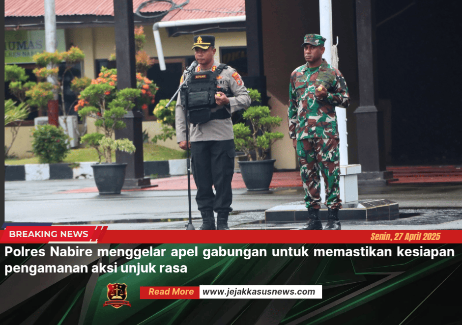Jejakkasus News |Nabire Papua Tengah – Polres Nabire menggelar apel gabungan untuk memastikan kesiapan pengamanan aksi unjuk rasa pada Senin, 27 April 2026 pukul 07.00 WIT di Mako Polres Nabire. Apel dipimpin oleh Kapolres Nabire AKBP Samuel D. Tatiratu, S.I.K., CPHR., didampingi Dir Samapta Polda Papua Tengah Kombes Pol. Tolopan Tambok Simanjuntak, S.I.K., M.Si., serta Kabid Propam Polda Papua Tengah Kompol Florensin Yuliet Nari, S.H., bersama personel gabungan TNI/Polri dan Satpol PP Provinsi Papua Tengah.