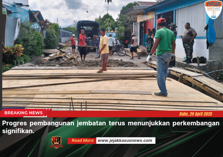 Jejakkasus News |Nabire Papua Tengah – Progres pembangunan jembatan Peintis Garuda di Kelurahan Girimulyo terus menunjukkan perkembangan signifikan. Memasuki tahapan krusial, prajurit bersama masyarakat kini melaksanakan perakitan rangkaian besi sebagai persiapan pengecoran struktur utama jembatan.